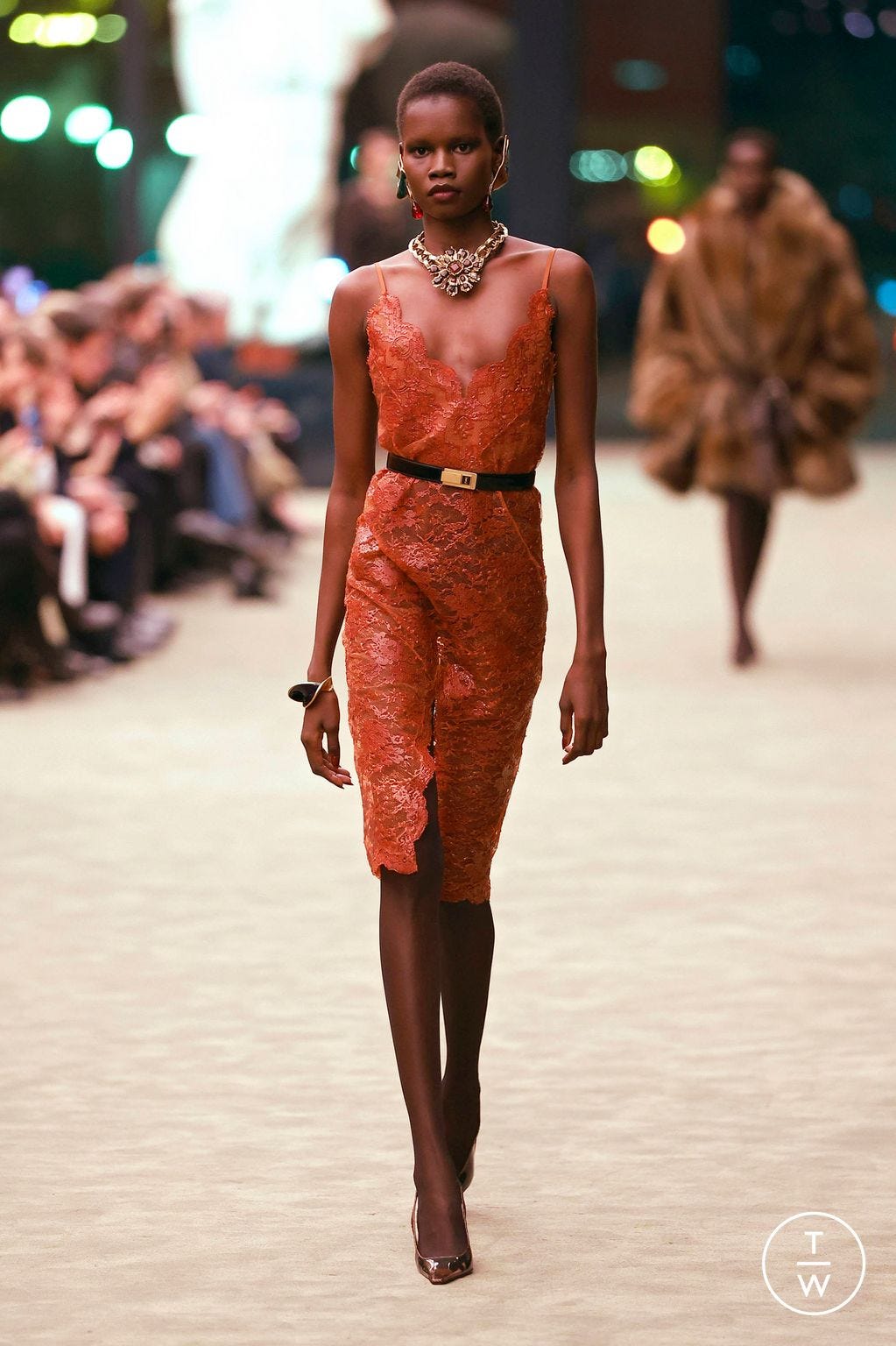 A parade of lace slip dresses, tops and skirts was to follow. Most in sunset tones and some in a glimmering metallic. The Saint Laurent woman never fails to bring the sex appeal, and this show was no exception. However, this season she’s swapped out her sporty track jacket for a fur coat, which was disproportionately large in the most glamorous way, of course.